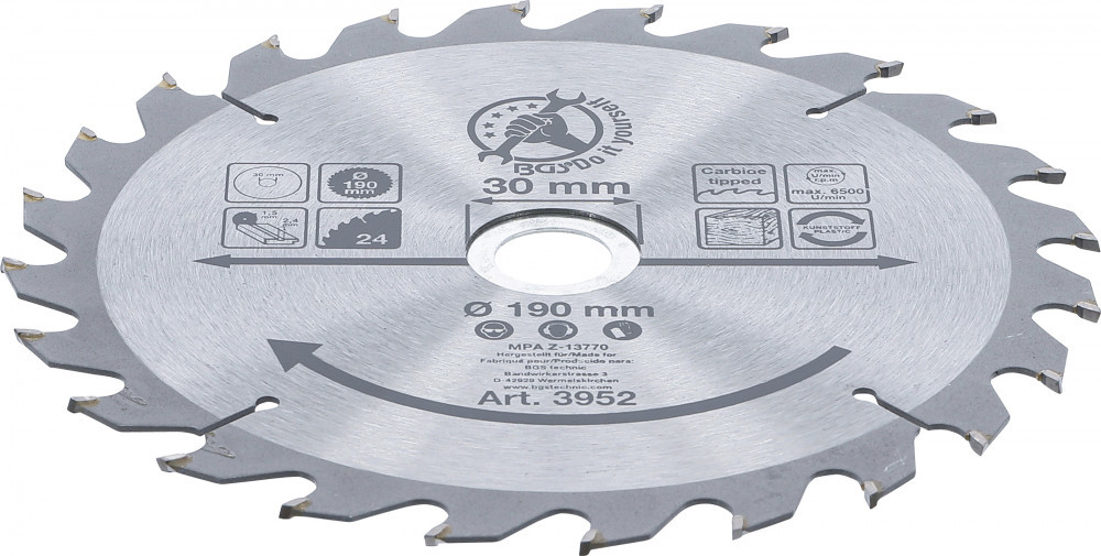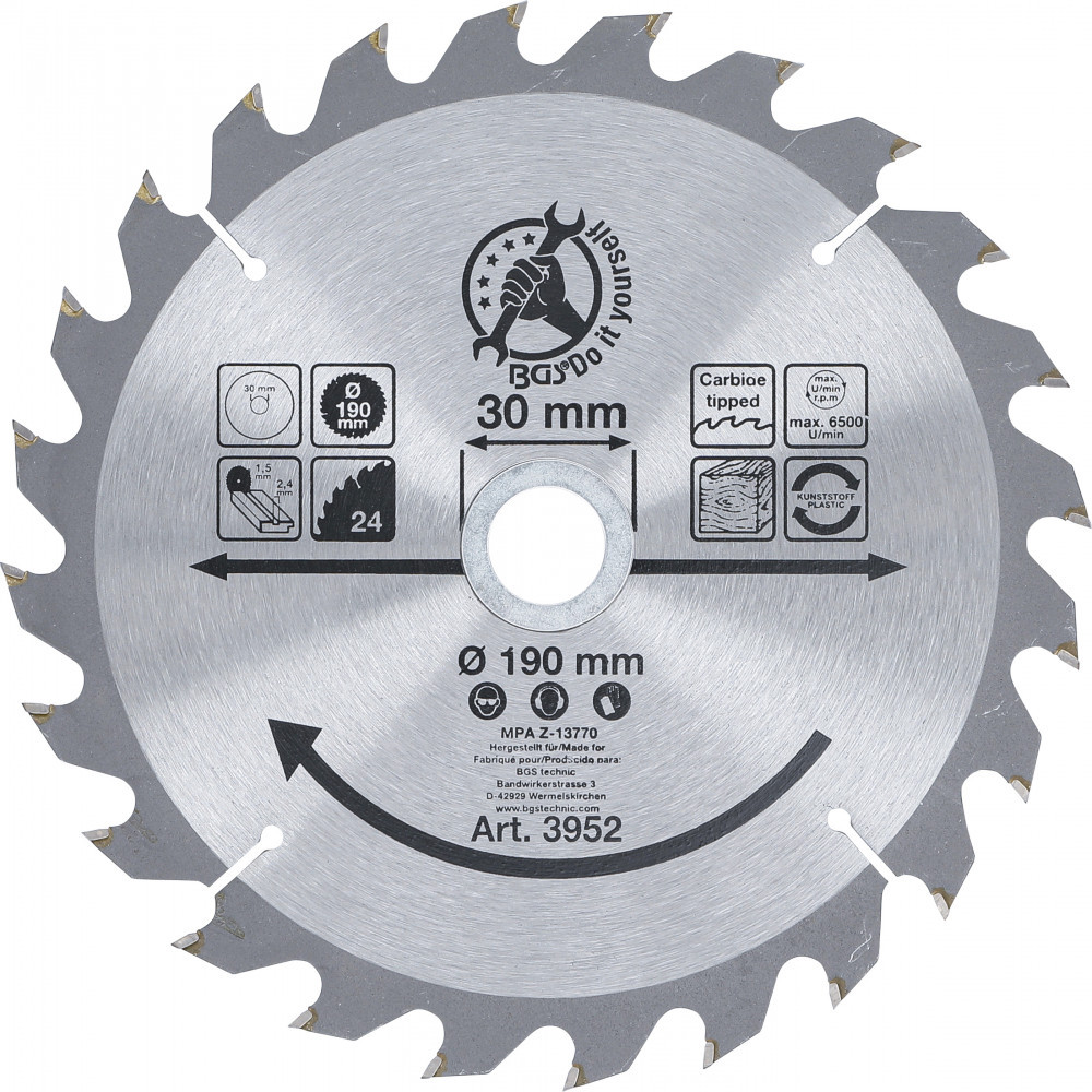 BGS DIY Karbid hegyű körfűrész tárcsa, 190 x 30 x 2.5 mm, 24 fogú (BGS 3952)