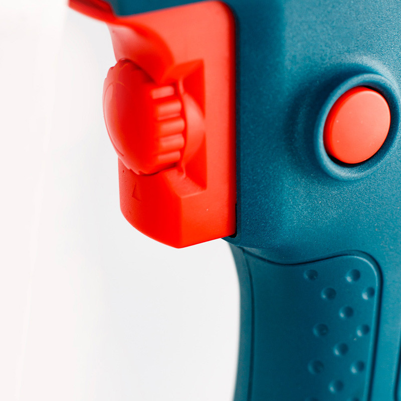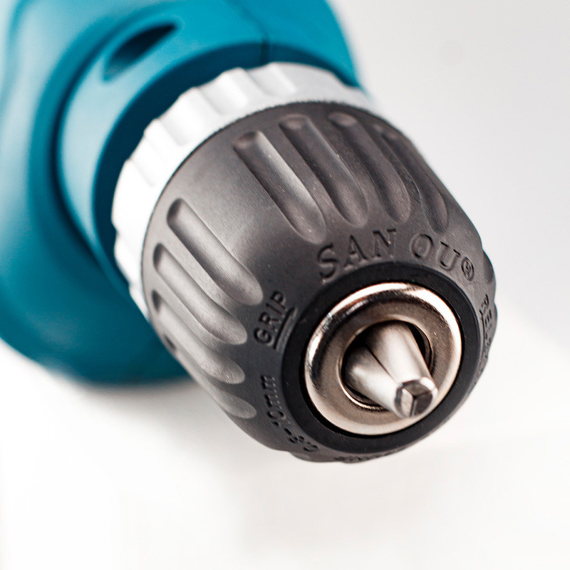 Erős motor változtatható sebességű ravasz kapcsolóval, amely rögzíthető a hosszan tartó működés és sebességszabályozás érdekében. Automata tokmány a gyors fúrófej cseréhez. Az ergonomikusan tervezett puha markolat és a könnyű szerszám súlya kényelmes és biztonságos kezelést biztosít hosszú munkaidő alatt.