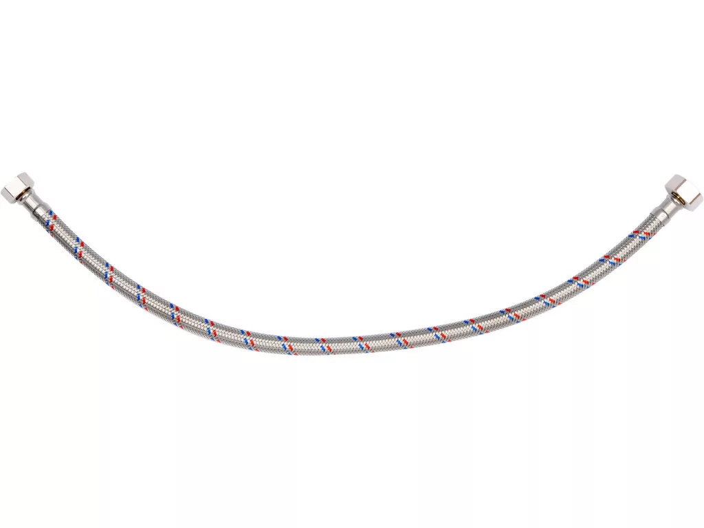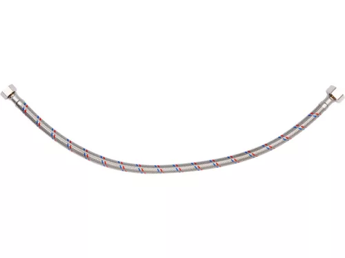 Rugalmas, rozsdamentes acél fonott csatlakozótömlő. Hideg és meleg vízhez készült. PZH tanúsítvánnyal rendelkezik az ivóvízzel való érintkezésre. Hossza 500 mm. Max nyomás 1MPa. Max hőmérséklet 90st C. Átlagos áramlási sebesség 32L/min. Belső átmérője 8mm, külső átmérője 12mm. Csatlakozó menet: anya 1/2" x anya 3/8". Gumitömlő EPDM gumiból, nikkelezett sárgaréz csatlakozók, EPDM gumi tömítés.