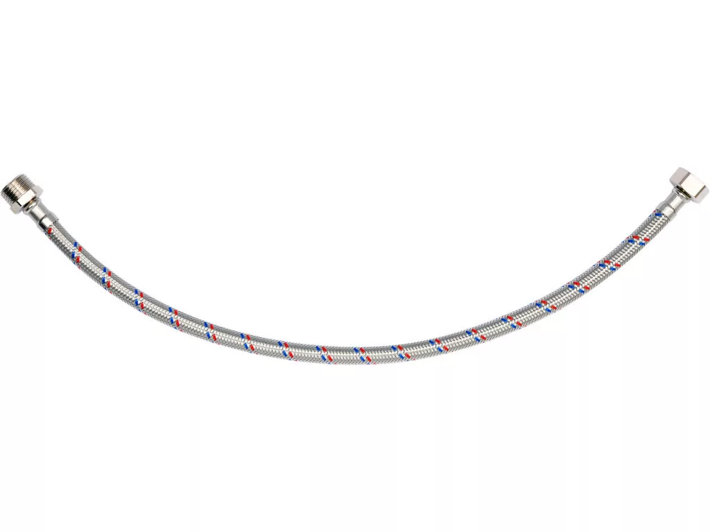 Rugalmas, rozsdamentes acél fonott csatlakozótömlő. Hideg és meleg vízhez készült. PZH tanúsítvánnyal rendelkezik az ivóvízzel való érintkezésre. Hossza 500 mm. Max nyomás 1MPa. Max hőmérséklet 90st C. Átlagos áramlási sebesség 32L/min. Belső átmérője 8mm, külső átmérője 12mm. Csatlakozó menet: anya 1/2" x apa 1/2". Gumitömlő EPDM gumiból, nikkelezett sárgaréz csatlakozók, EPDM gumi tömítés.