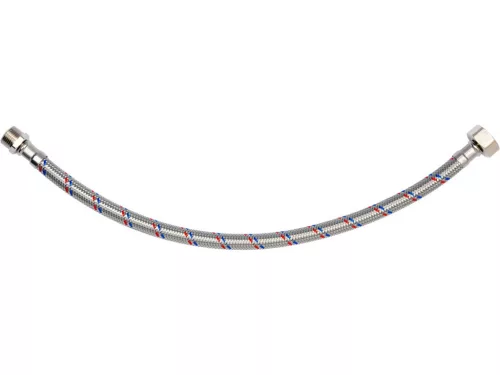 Rugalmas, rozsdamentes acél fonott csatlakozótömlő. Hideg és meleg vízhez készült. PZH tanúsítvánnyal rendelkezik az ivóvízzel való érintkezésre. Hossza 400 mm. Max nyomás 1MPa. Max hőmérséklet 90st C. Átlagos áramlási sebesség 32L/min. Belső átmérője 8mm, külső átmérője 12mm. Csatlakozó menet: anya 1/2" x apa 3/8". Gumitömlő EPDM gumiból, nikkelezett sárgaréz csatlakozók, EPDM gumi tömítés.