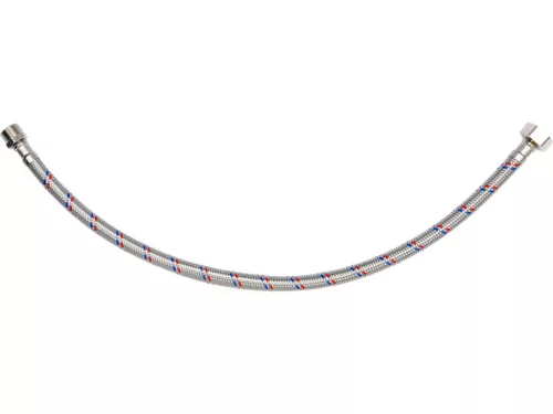 Rugalmas csatlakozótömlő csaptelepekhez fonott rozsdamentes acélból. Hideg és meleg vízhez készült.