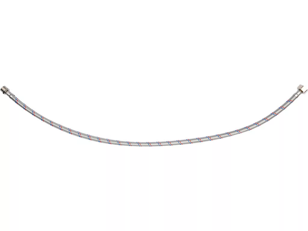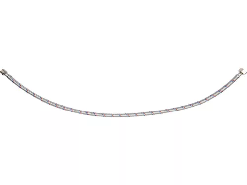 Rugalmas, rozsdamentes acél fonott csatlakozótömlő. Hideg és meleg vízhez készült. PZH tanúsítvánnyal rendelkezik az ivóvízzel való érintkezésre. Hossza 800mm. Max nyomás 1MPa. Max hőmérséklet 90st C. Átlagos áramlási sebesség 32L/min. Belső átmérője 8mm, külső átmérője 12mm. Csatlakozó menet: anya 1/2" x apa 3/8". Gumitömlő EPDM gumiból, nikkelezett sárgaréz csatlakozók, EPDM gumi tömítés.