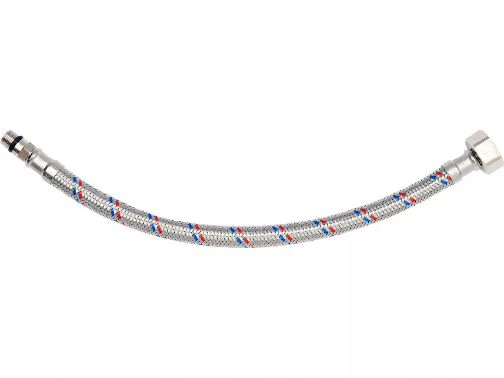 Rugalmas csatlakozótömlő csaptelepekhez fonott rozsdamentes acélból. Hideg és meleg vízhez készült.