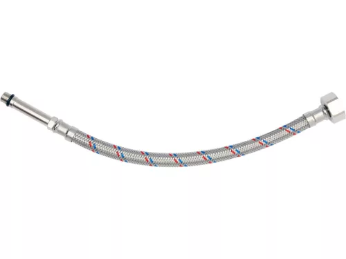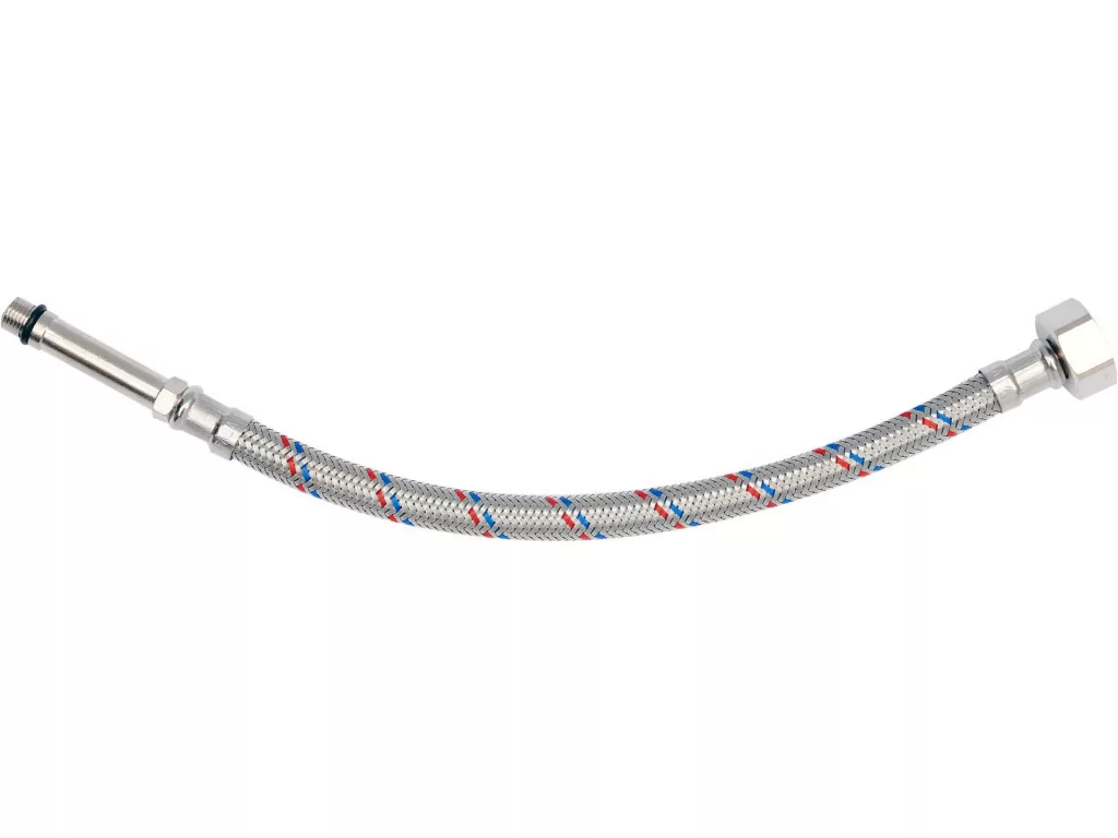 Rugalmas csatlakozótömlő csaptelepekhez fonott rozsdamentes acélból. Hideg és meleg vízhez készült.