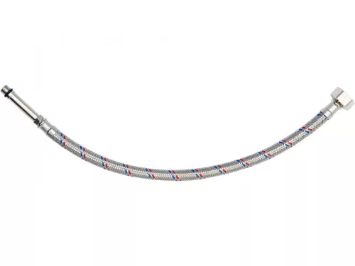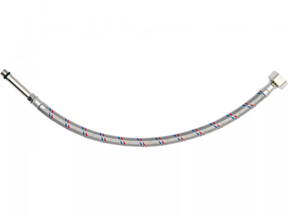 Rugalmas csatlakozótömlő csaptelepekhez fonott rozsdamentes acélból. Hideg és meleg vízhez készült.