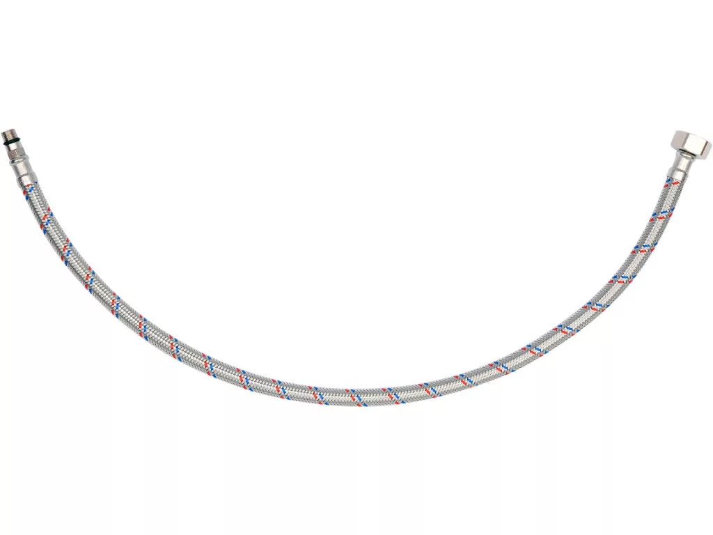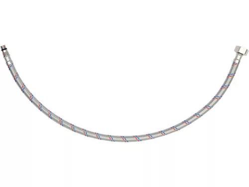 Rugalmas csatlakozótömlő csaptelepekhez fonott rozsdamentes acélból. Hideg és meleg vízhez készült.