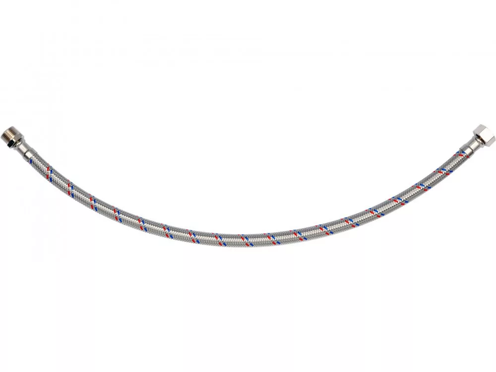 Rugalmas csatlakozótömlő csaptelepekhez fonott rozsdamentes acélból. Hideg és meleg vízhez készült.