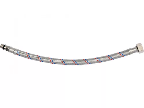 Rugalmas csatlakozótömlő csaptelepekhez fonott rozsdamentes acélból. Hideg és meleg vízhez készült.