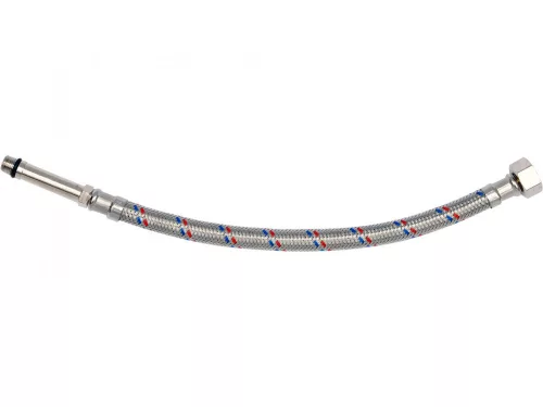 Rugalmas csatlakozótömlő csaptelepekhez fonott rozsdamentes acélból. Hideg és meleg vízhez készült.