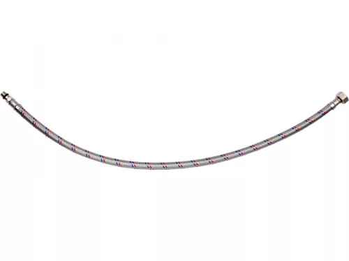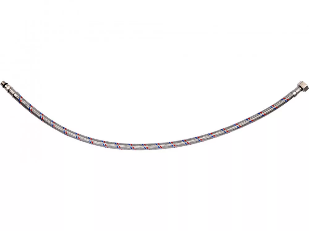 Rugalmas csatlakozótömlő csaptelepekhez fonott rozsdamentes acélból. Hideg és meleg vízhez készült.
