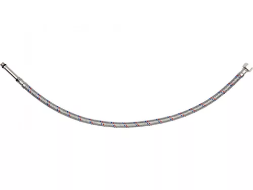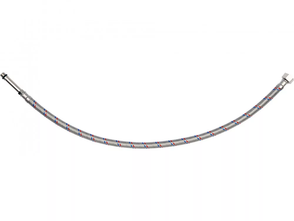Rugalmas, nemesacél fonott csatlakozótömlő csaptelepekhez. Hideg és meleg vízhez készült. A PZH tanúsítja, hogy ivóvízzel érintkezik. Hossza 600mm. Max nyomás 1MPa. Max hőmérséklet 90st C. Átlagos áramlási sebesség 32L/min. Belső átmérője 8mm, külső átmérője 12mm. Csatlakozómenet: anya 3/8" x apa M10 (50mm hosszú). Gumitömlő EPDM gumiból, nikkelezett sárgaréz csatlakozók, EPDM gumi tömítés.
