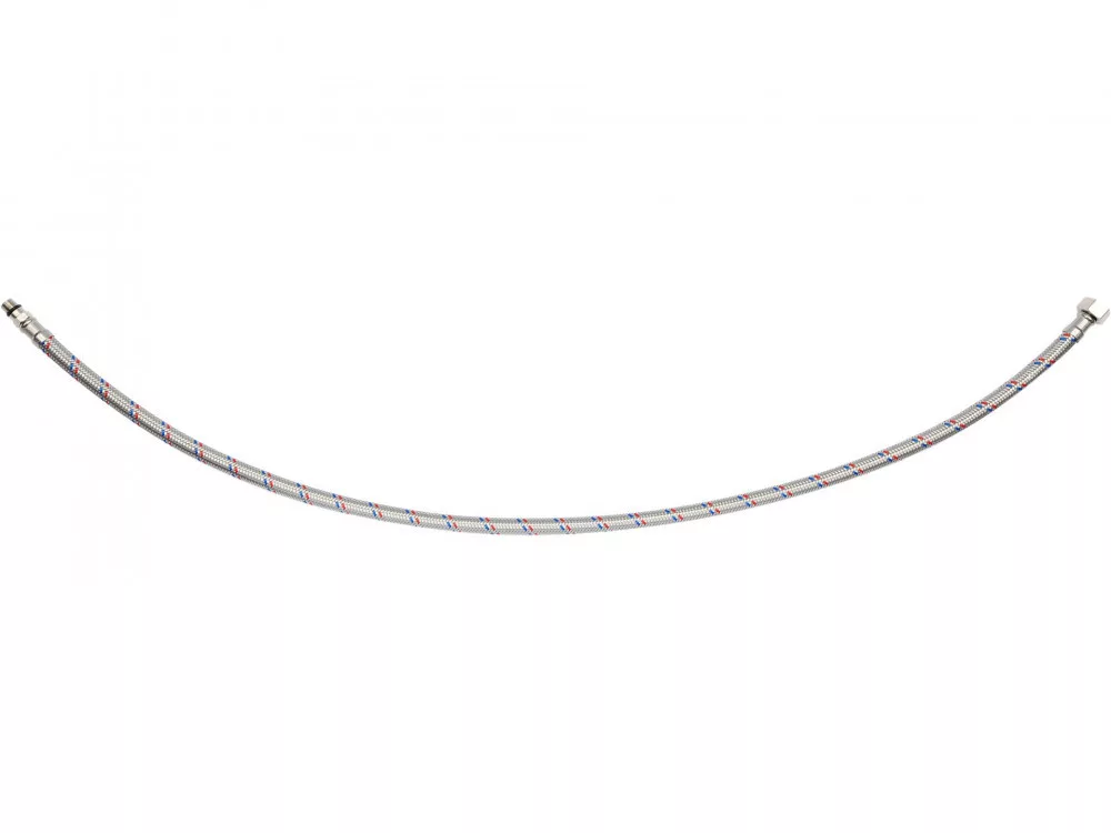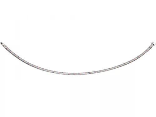 Rugalmas, nemesacél fonott csatlakozótömlő csaptelepekhez. Hideg és meleg vízhez készült. A PZH tanúsítja, hogy ivóvízzel érintkezik. Hossza 800mm. Max nyomás 1MPa. Max hőmérséklet 90st C. Átlagos áramlási sebesség 32L/min. Belső átmérője 8mm, külső átmérője 12mm. Csatlakozómenet: anya 3/8" x apa M10 (17mm rövid). Gumitömlő EPDM gumiból, nikkelezett sárgaréz csatlakozók, EPDM gumi tömítés.