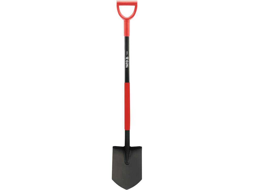 A YATO éles ásó ergonomikusan formázott fém nyéllel, "DY-műanyag" fogantyúval.
