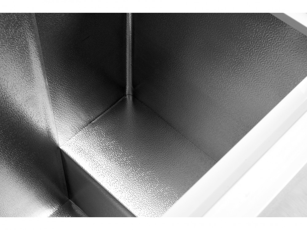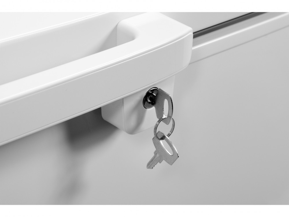 Professzionális vendéglátóipari fagyasztóláda. Önzáró, fogantyús, csuklós ajtóval és zárral rendelkezik.