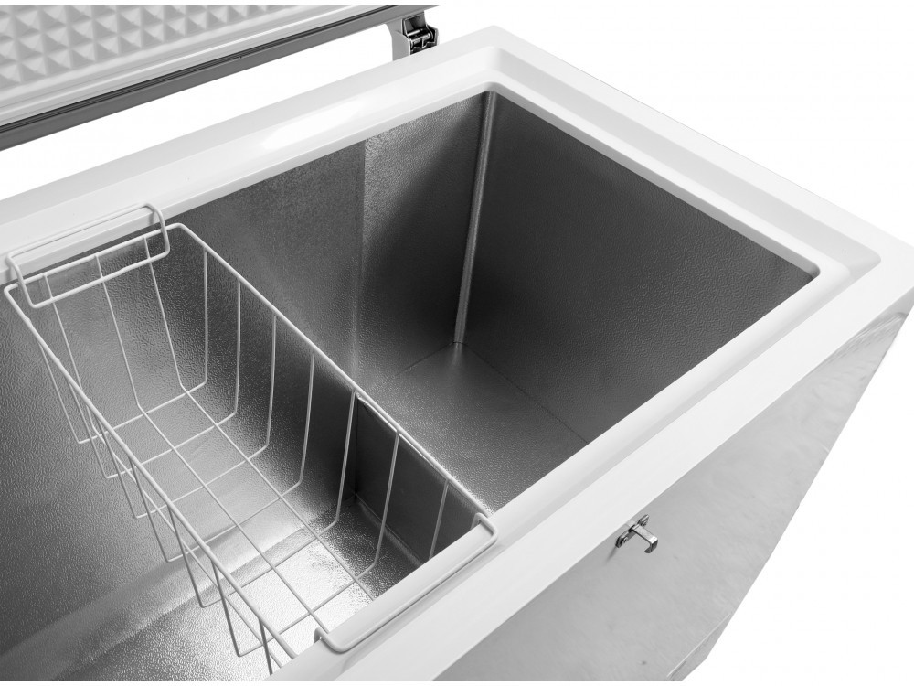 Fagyasztóláda professzionális vendéglátáshoz. Önzáró, fogantyús, csuklós ajtóval és zárral rendelkezik.