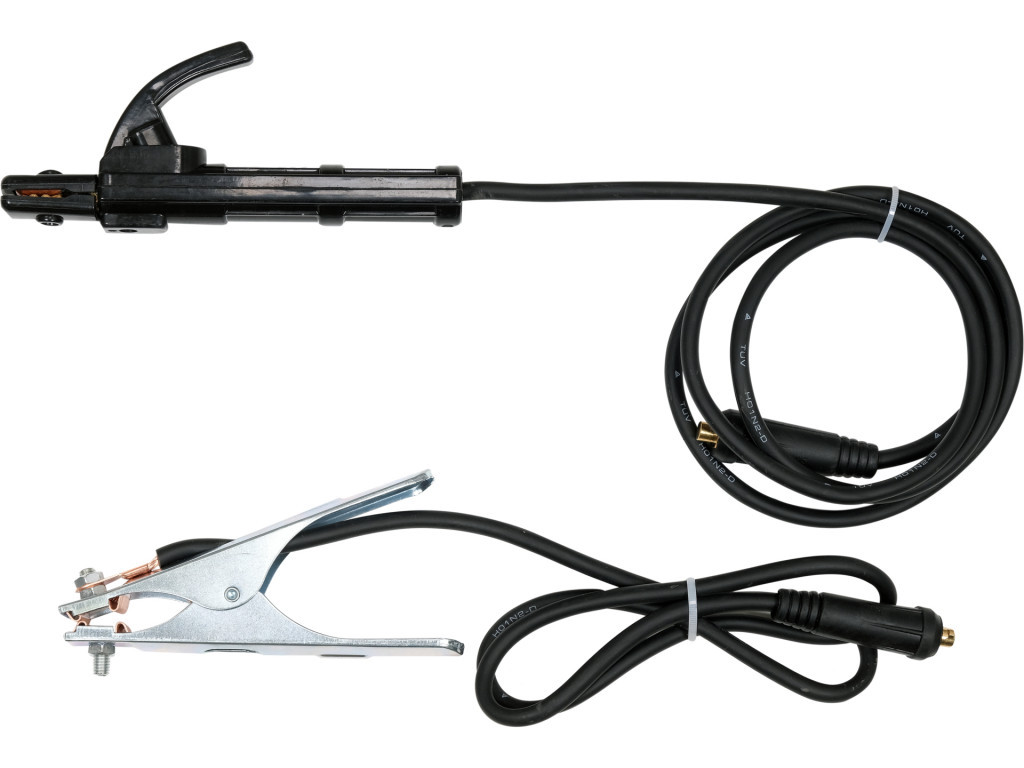 - Állítsa be a tartalmat: hegesztőgép, tömegtartó 150 A, 1,2 m (10 mm2), elektródatartó 200 A, 1,8 m (10 mm2), tápkábel 2,4 m, vállpánt