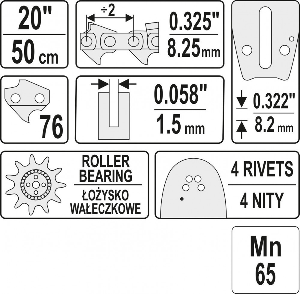 Hosszúság 20", 76 láncszem, osztás 0.325", szélesség 0.058" (1,5 mm).