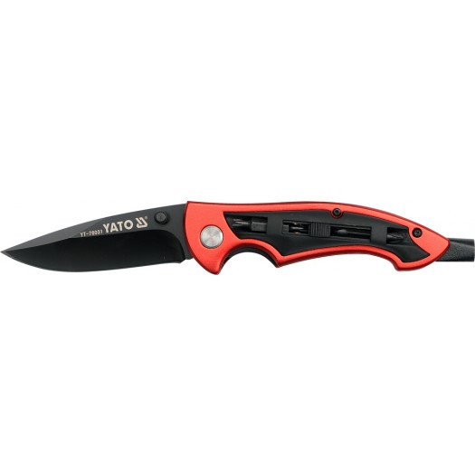 YATO összecsukható kés 95 mm hosszú, fekete, tömör, fekete drop point pengével, egykezes nyitással, véletlenzárral, ergonomikus fémtest beépített gumibevonatú tálcával, amely 8 darab, a leggyakoribb méretekből álló, hosszabbítható bitet tartalmaz, mágneses bit tartó a markolat végén, tépőzáras övtáska mellékelve.