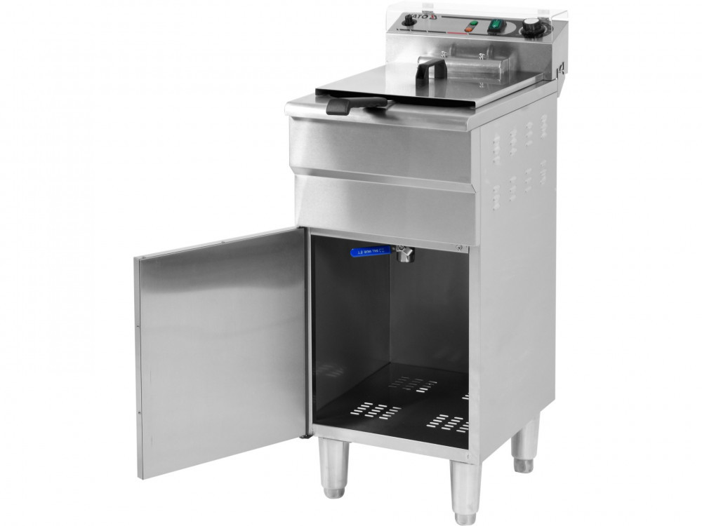 A szabadon álló olajsütő alatt egy további szekrény található, amelynek mérete 370x315x390 mm, és zárható ajtaja van. A szekrény belsejében, 32 cm magasságban, van egy leeresztő csap, amely lehetővé teszi az olaj leeresztését a tartályból. Ez különösen hasznos tulajdonság, amely gyors olajcserét tesz lehetővé. Ezenkívül lehetővé teszi a régi olaj közvetlenül a kannába történő öntését, így minimalizálva a kiömlés kockázatát. A szekrény négy állítható magasságú (13,5~16 cm) lábon áll.