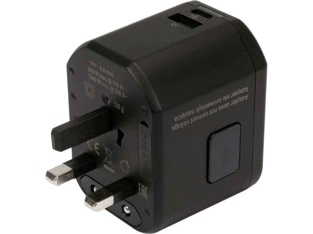 Adapter beépített töltővel és két USB porttal, gyors töltési technológiával, több mint 150 ország szabványának megfelelő.